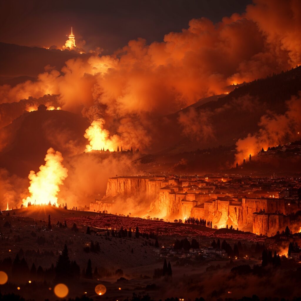 The fourth plague causes the sun to scorch people with fierce heat, yet they refuse to repent (Rev. 16:8–9). The fifth plague brings total darkness upon the Beast’s kingdom, causing unbearable agony of gnawing their tongue, and they continue to blaspheme God (Rev. 16:10–11). The sixth plague dries up the Euphrates River, making way for the kings of the East and setting the stage for the Battle of Armageddon (Rev. 16:12–16). The seventh plague unleashes the greatest worldwide earthquake in human history, causing islands to disappear and mountains to fall. In addition, there will be enormous hailstones that fall from the sky, crushing everything in their path (Rev. 16:17–21; 17:18).
